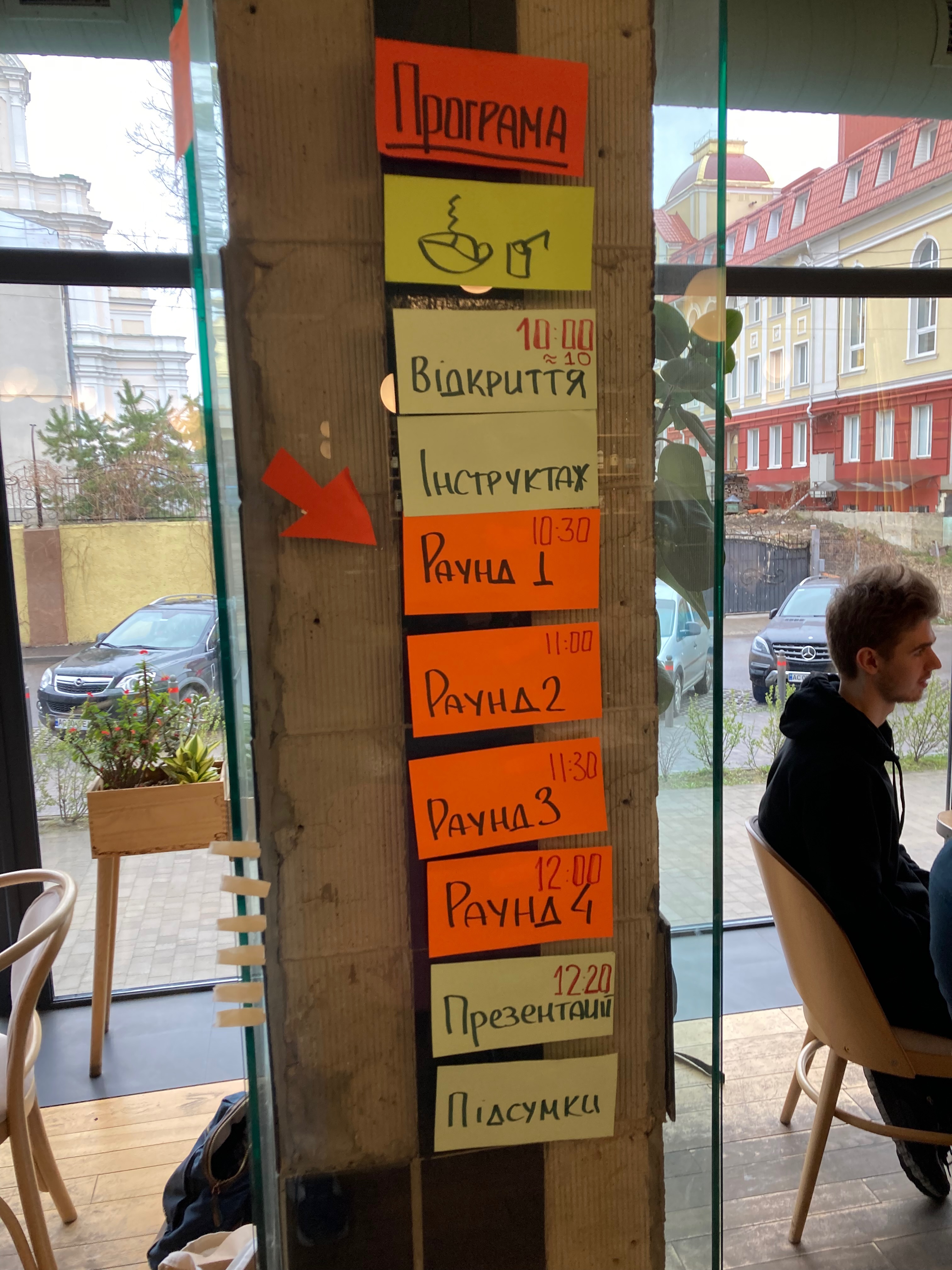 ■ Написати програму заходу так, щоб її видно було усім учаснимам (А1, картки на стіні)