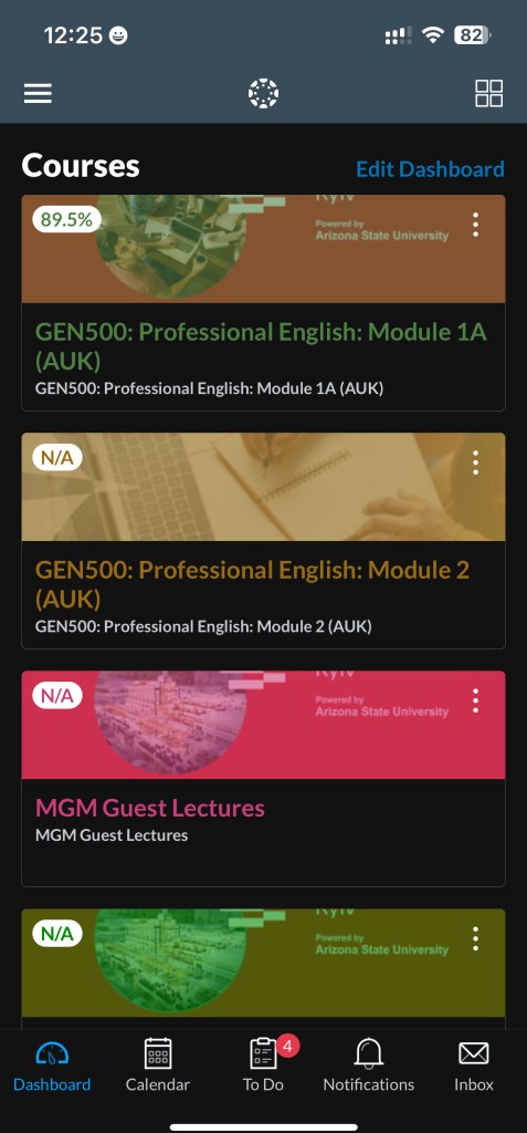 Напередодні 1 вересня нам надіслали лінк на програму Canvas. Це середовище, яке дозволяє бачити курси, їх структуру, силабус, завдання, матеріали і бали, які ти набираєш протягом курсу. З хорошого – як тільки зявляється домашнє завдання, воно потрапляє в TO DO. Оскільки я користуюся таск-менеджером вже багато років, такий спосіб організації задач мені дуже зайшов. Крім того, як правило (бувають глюки), лекції з Canvas синхронізуються з моїм календарем, тому я відразу бачу коли у мене лекція, і за яким лінком заходити, коли вона почалася. Не завжди так є чомусь, але чат групи зазвичай швидко виручає, якщо незрозуміло, за яким лінком заходити на лекцію.
