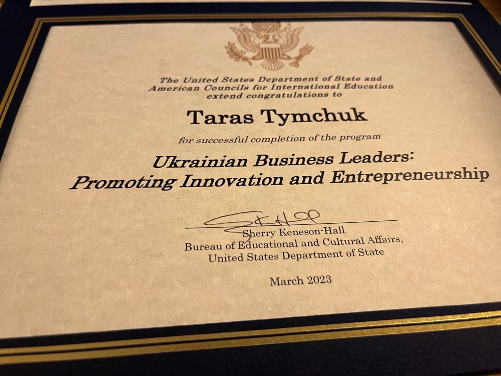 З 1 по 20 березня 2023 року мав нагоду взяти участь у навчальному візиті до США в рамках програми Ukrainian Business Leaders Promoting Innovation and Entrepreneurship.