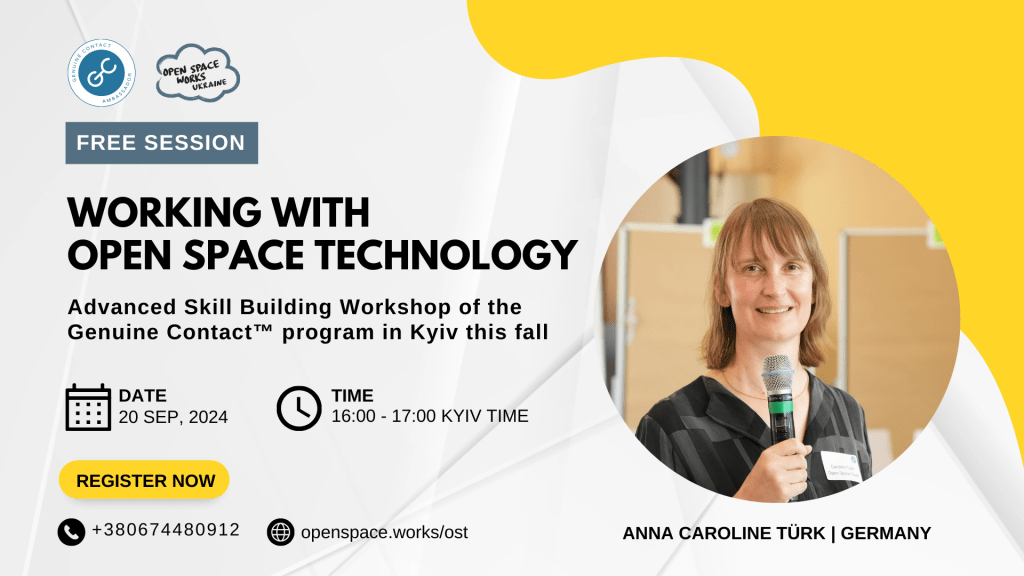 20-22 жовтня 2024 року в м. Київ пройде тренінг для тих, хто хоче опанувати для себе Технологію Відкритого Простору як інструмент вирішення складних завдань, пошуку проривних рішень, інновацій, налагодження продуктивної взаємодії. Передуватиме тренінгу інформаційна сесія від німецької фасилітаторки з багаторічним досвідом практикування цього методу Анни Кароліни Тюрк, яка зможе відповісти на питання тих, хто розглядає варіант пройти це навчання, яке організовує OSWU і Genuine Contact.