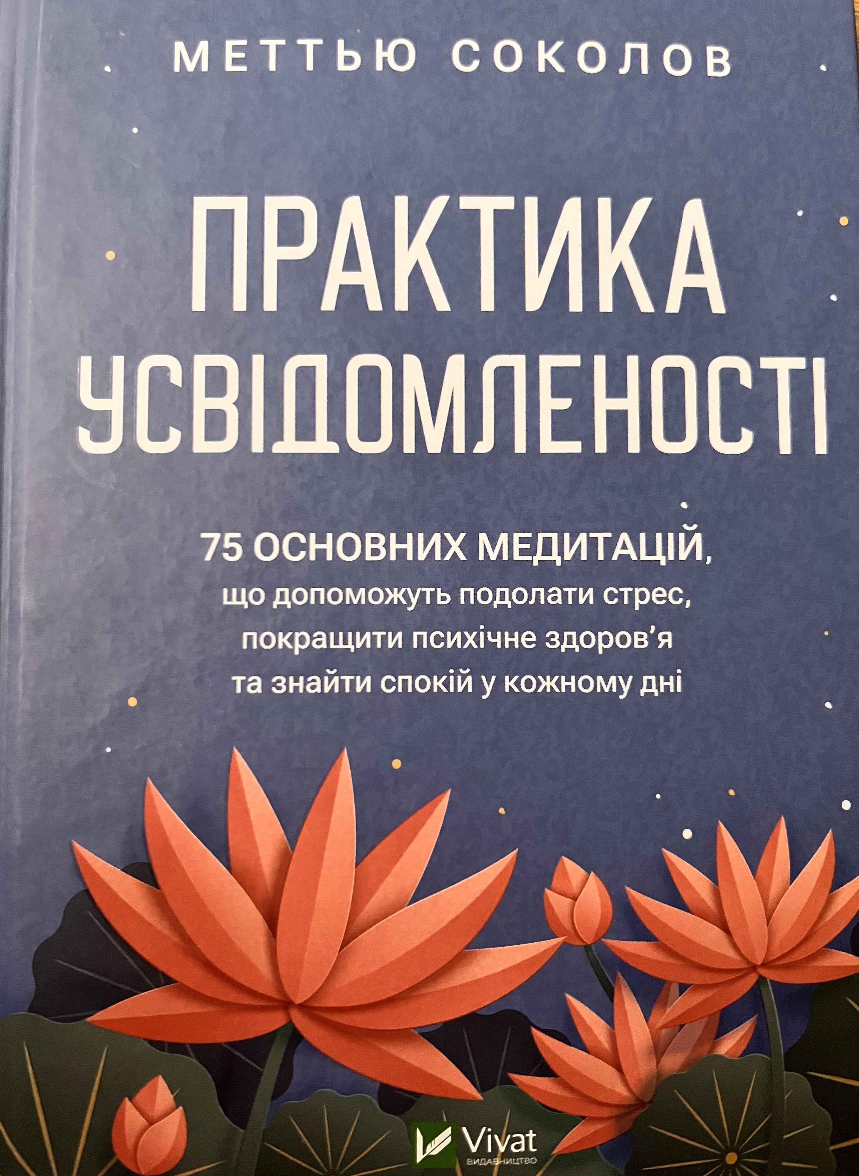 В книгарні натрапив на книжку Меттью Соколова “Практика усвідомленості: 75 основних медитацій, що допоможуть подолати стрес, покращити здоров’я та знайти спокій у кожному дні”. А оскільки я, як і вся країна живе на межі балансування кукухи, то я книжку купив і вирішив попрактикувати те, що там викладено.