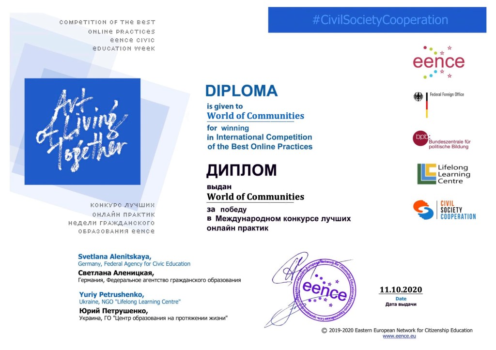 - 2020 — онлайн-платформа «Світ Громад» здобула звання кращої онлайн-практики за результатами міжнародного конкурсу у межах Тижня громадянської освіти EENCE (Eastern European Network for Citizenship Education).