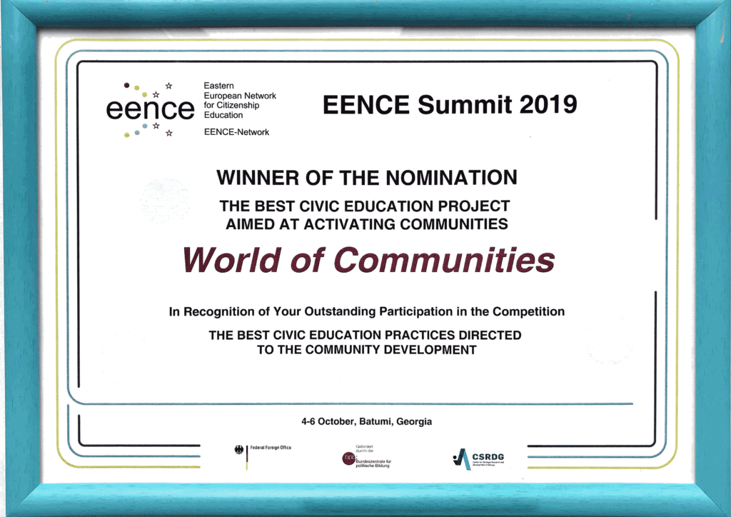 - 2019 — настільна симуляційна гра «Світ Громад» була відзначена як найкращий проєкт громадянської освіти, спрямований на активізацію громад на EENCE Summit (Батумі, Грузія). Гра здобула перемогу в номінації «The Best Civic Education Project Aimed at Activating Communities».